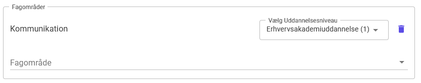 For hvert fagområde skal du derefter angive det uddannelsesniveau, som censoren skal være beskikket til – f.eks. bachelor- eller kandidatniveau. Hvis du kommer til at vælge et forkert fagområde, så kan du trykke på skraldespandsikonet for at slette det valgte fagområde. Bemærk, at det er muligt at angive flere fagområder ved at trykke på linjen, hvor der står Fagområde.