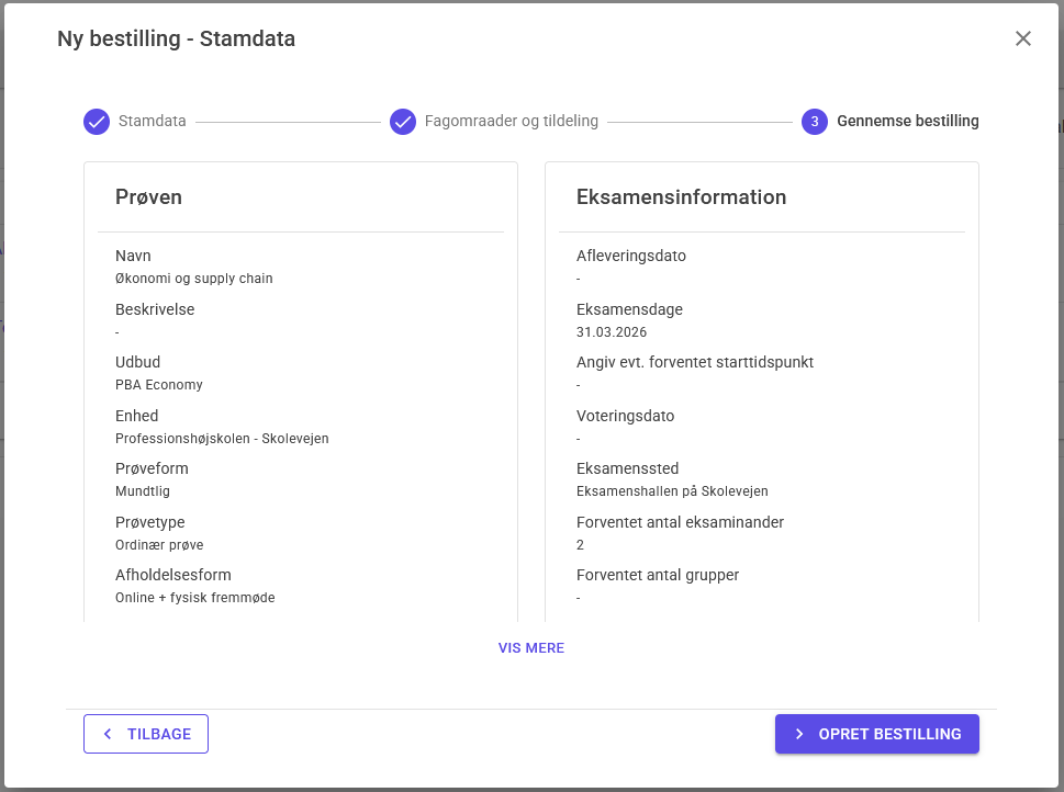 I det sidste trin Gennemse bestilling, så kan du få et overblik over de valgte indstillinger samt mulighed for at se hvordan bestillingen vil se ud for censor. Når du har gennemført dette trin, ved at trykke på den blå knap Opret bestilling nederst til højre, er din opgave som planlægger afsluttet. Den videre allokering vil blive håndteret af censorformanden eller administrator.