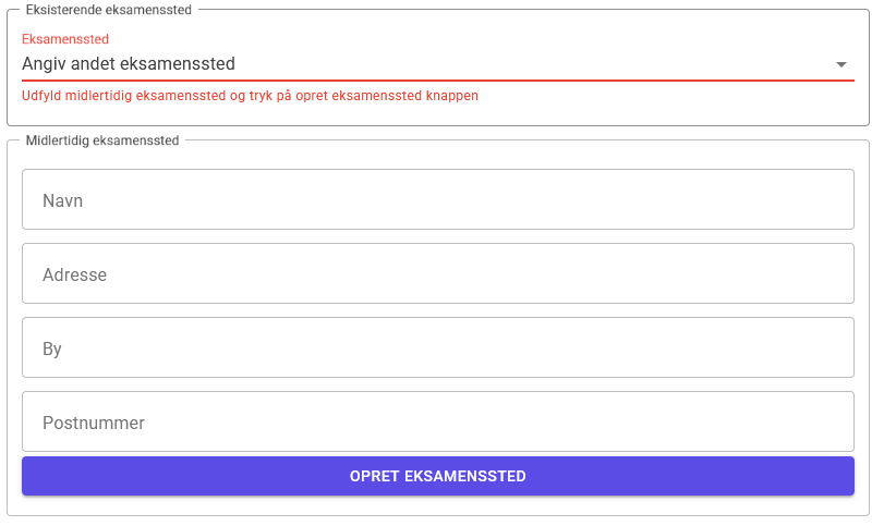 Hvis det ønskede eksamenssted ikke findes, kan du vælge Angiv andet eksamenssted. Dette eksamenssted vil kun blive anvendt til den pågældende bestilling og gemmes ikke til senere brug. Her skal du indtaste Navn, Adresse, By og Postnummer.