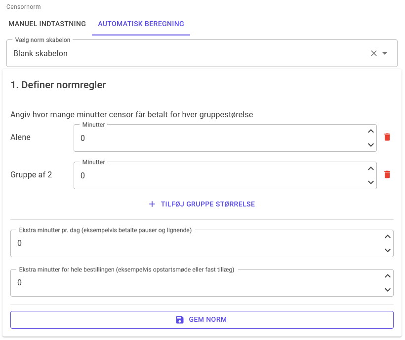 Hvis du anvender en tom skabelon, kan du som udgangspunkt angive normer for eksaminander, der går op individuelt eller i grupper på to. Ved at vælge Tilføj gruppestørrelse kan du udvide den maksimale gruppestørrelse og angive en tilhørende censornorm.