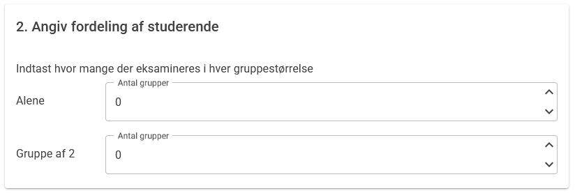 Angiv fordeling af studerende – Indtast hvor mange studerende der forventes i hver gruppestørrelse. Fordelingen kan senere justeres, hvis det faktiske antal ændrer sig.