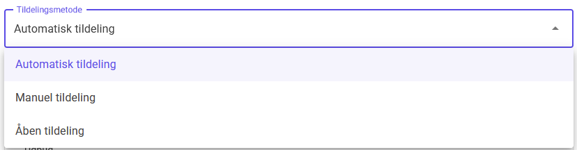 Når fagområder og uddannelsesniveau er valgt, skal du vælge, hvilken tildelingsmetode du ønsker at bruge. Hver opmærksom på, at ikke alle tildelingsformer er nøvendigvis usynlige, som beskrevet tidligere. De mulige tildelingsmetoder kan blive ændre af administrator. Som udgangspunkt er altid automatisk muligt.