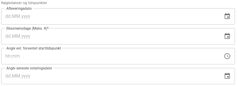Eksamensdage (Maks. 4) – Vælg de dage, hvor eksamen afholdes. Dette felt vises kun, hvis prøveformen Mundtlig er valgt og er obligatorisk.