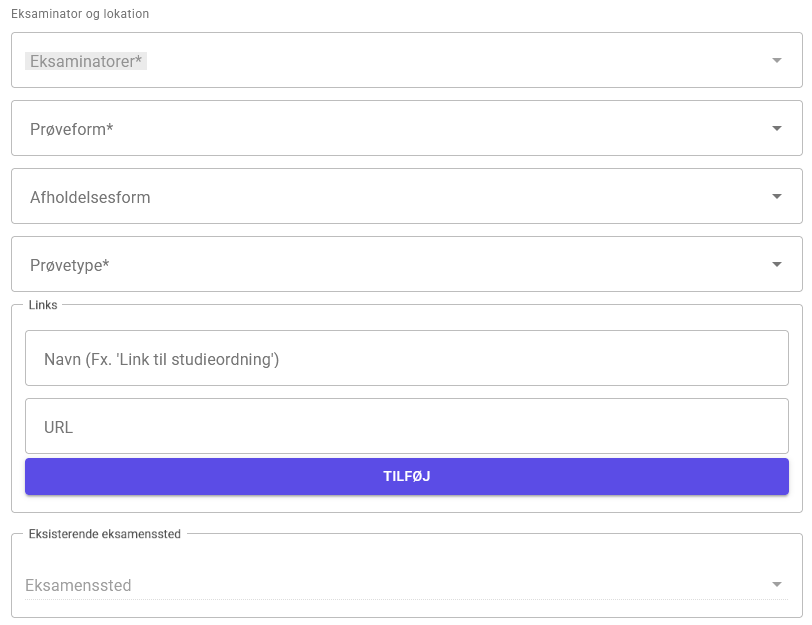 Eksisterende eksamenssted – Dette felt vises ikke, hvis afholdelsesformen Online er valgt. Her kan du vælge mellem de eksamenssteder, der er knyttet til udbuddet på den enhed, som bestillingen oprettes til.
