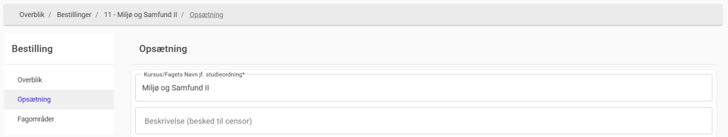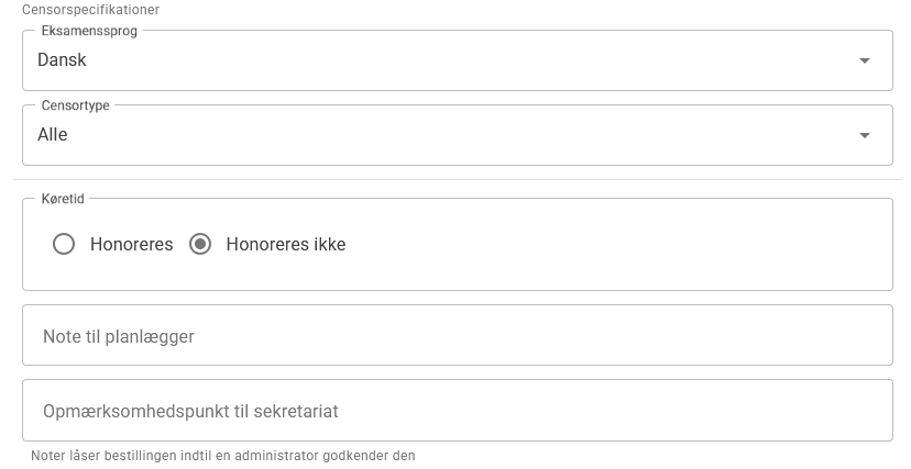 Censornorm (i minutter) pr. eksaminand – Angiv censornormen pr. eksaminand i minutter. Dette tal multipliceres med det forventede antal eksaminander for at beregne den samlede censornorm, som censor modtager ved allokering til bestillingen.
