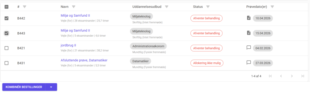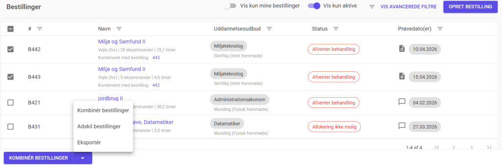 Når de ønskede bestillinger er valgt, skal du bruge multiknappen nederst og vælge ”Kombinér bestilling”. Herefter vil bestillingerne blive knyttet sammen. Du kan se, hvilke bestillinger der er kombineret, ved at teksten ”Kombineret med bestilling [Eksamens #]” vises under bestillingsnavnet.