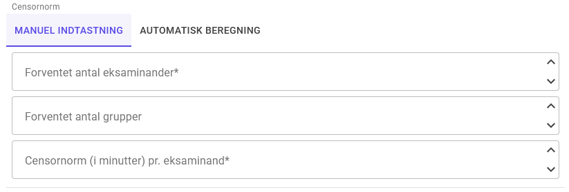 Censornorm – Her kan du vælge mellem to måder at beregne censornormen på: Manuel indtastning eller Automatisk beregning.
