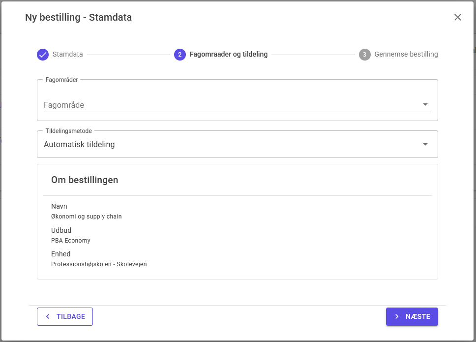 Når alle påkrævede felter er udfyldt, kan du gå videre til næste trin Fagomraader og tildeling ved at klikke på den blå knap Næste.