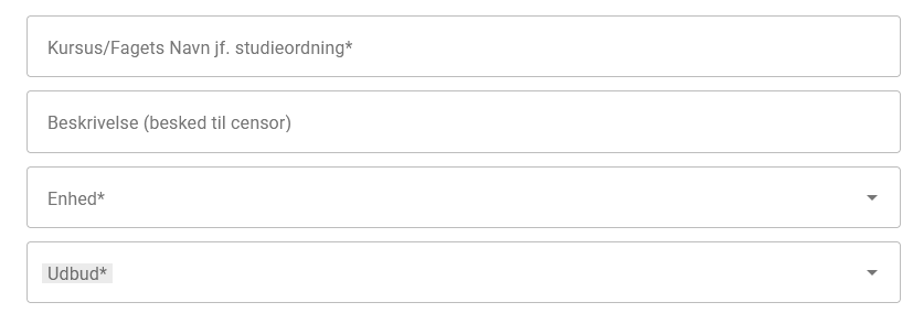 Kursus/fagets navn – Angiv fagets titel, som den fremgår af studieordningen. Feltet skal udfyldes for at kunne fortsætte.