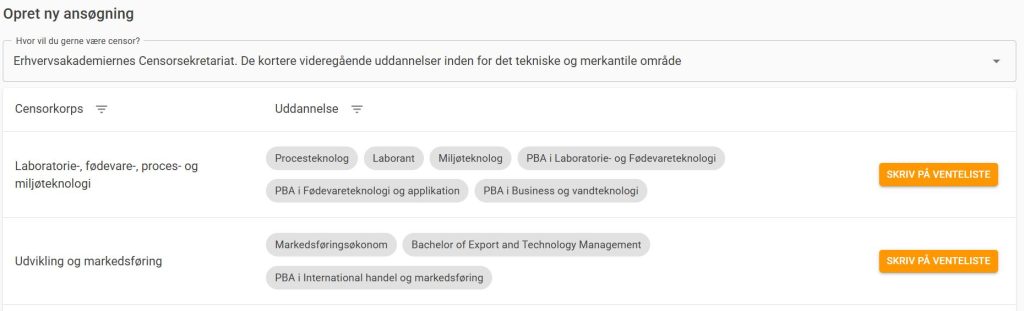 Hvis du ønsker at ansøge som censor, men det relevante censorkorps ikke har åbent for tilmeldinger, har du mulighed for at skrive dig på venteliste. Gå til https://censorum.dk/ansoegning og klik på den gule knap med teksten “Skriv på venteliste”. Når du klikker på knappen, åbnes en pop-up-boks.