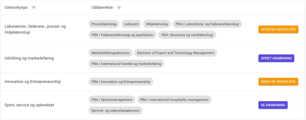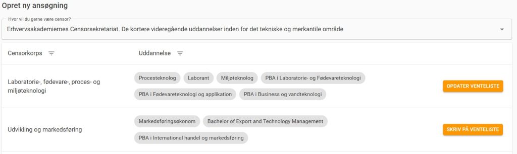 Hvis du har indtastet forkerte oplysninger eller ønsker at ændre dine fagområder, kan du altid vende tilbage til https://censorum.dk/ansoegning. Her vil der stå “Opdater venteliste” ud for det censorkorps, du har skrevet dig op til.