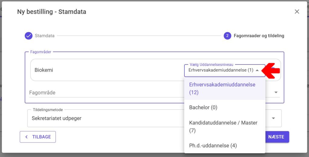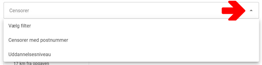 Udover det, så har du muligeden for at åbne et advancerede filtre, for at finde en specifikt bestilling du leder efter. Ved filteret kan du søge efter Udbud, Fagmråde, Uddannelsesnivea, Status, Dato, Oprettet Af samt Allokeret Censor.