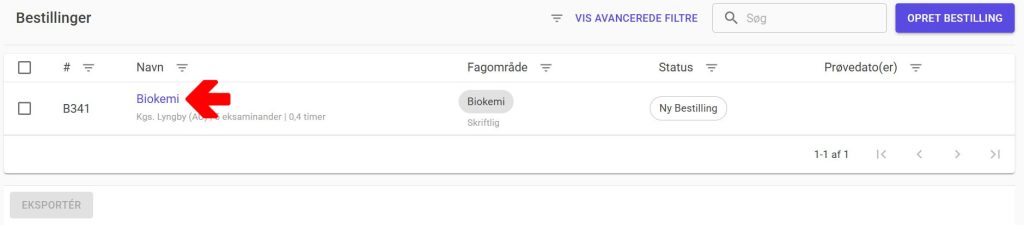 For at finde en eksamensberetning skal du først finde bestillingen på listen og klikke på det blå navn. Dette åbner oversigtssiden for den specifikke bestilling, hvor du får et generelt overblik.
