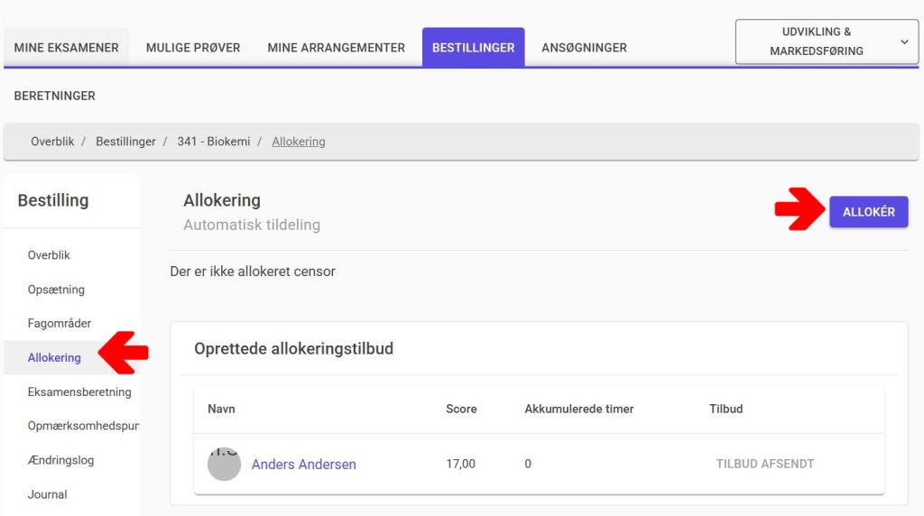 - Mangler allokering – Bestillingen har endnu ikke fået tildelt en censor. Dette kan dække over flere situationer: Bestillingen er ikke godkendt af administrator, Bestillingen afventer allokering, Allokering har vist sig ikke mulig.