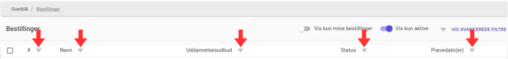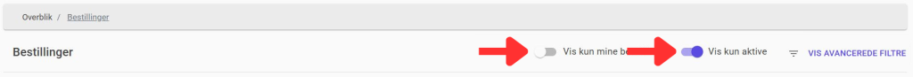 Når du tilgår bestillinger, så vil du finde en liste over alle bestillinger du har adgang til. Her har du muligheden for at vise kun dine bestillinger, vise kun de aktive bestillinger