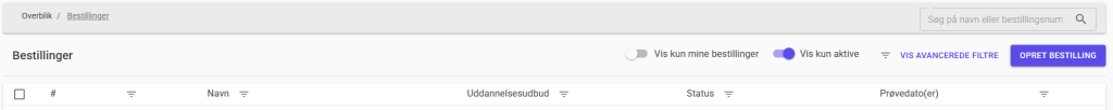 Listen over bestillinger vises i en tabel, som er opdelt i følgende kolonner: #, Navn, Uddannelsesudbud, Status og Prøvedato(er). Til højre for kolonnenavnene findes et filterikon, som gør det muligt at filtrere og søge efter specifikke bestillinger.